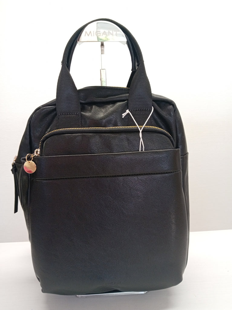 Reppu kahdessa värissä. Useita lokeroita ja taskuja. Edessä nepparitasku sekä vetoketjullinen tasku. Takana pienempi vetoketjullinen tasku. Isossa osiossa avointa tilaa sekä pieni vetoketjutasku.