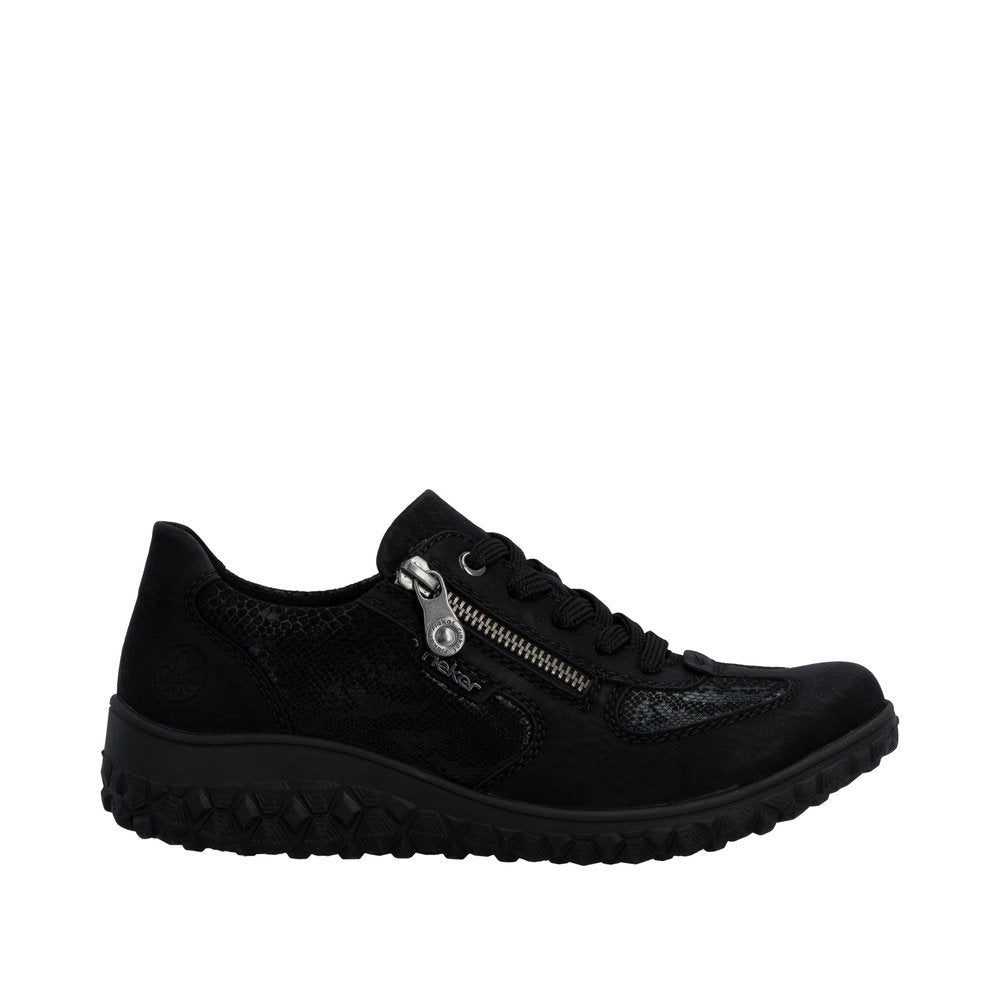 Rieker pehmoinen kävelykenkä reilummalla lestillä ja joustavilla yksityiskohdilla, jotka antaa jalan omille muodoille tilaa. Mallissa on nauhat ja vetoketju.