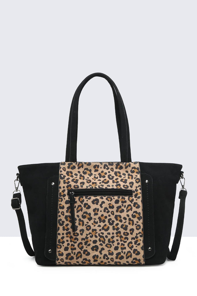 Keinomokka pintainen laukku leopardi yksityiskohdalla. Laukussa on kiinteät kahvat ja myös säädettävä hihna mukana. Sisällä on yksi vetoketjullinen sekä yksi avoin tasku. Edessä ja takana pieni vetoketju tasku.